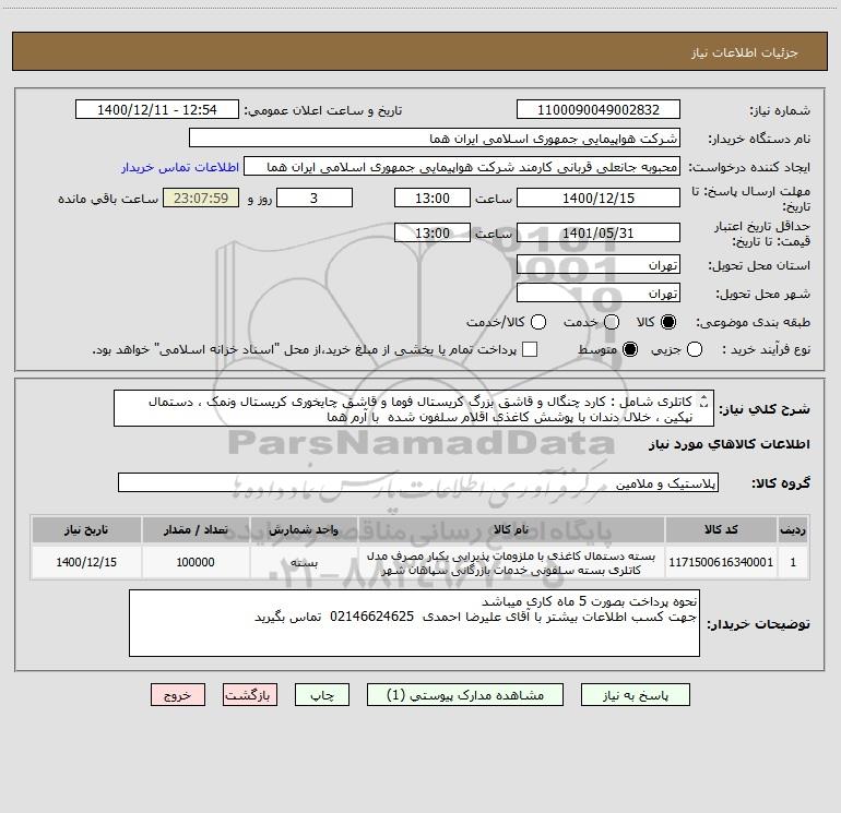 شرح کلی نیاز: کاتلری شامل : کارد چنگال و قاشق بزرگ کریستال فوما و قاشق چایخوری کریستال ونمک ، دستمال نپکین ، خلال دندان با پوشش کاغذی اقلام سلفون شده با آرم هما