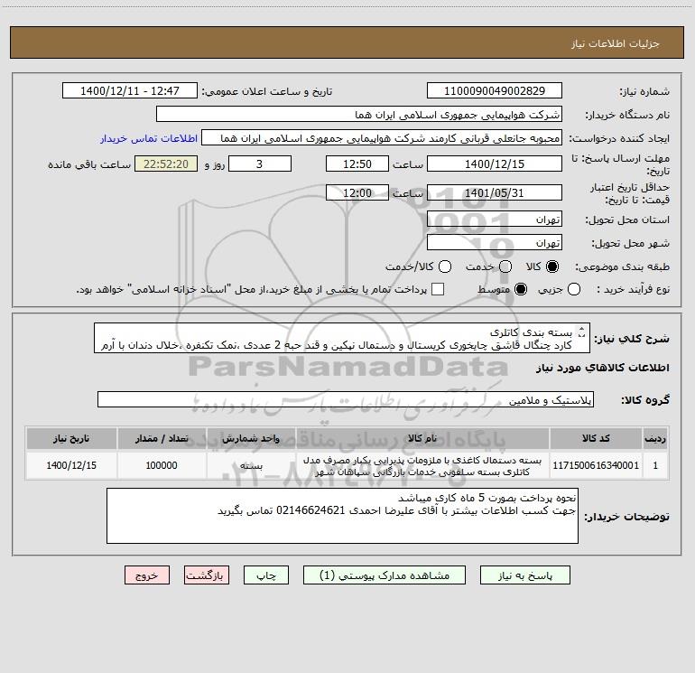 | 1 | 1171500616340001 | بسته دستمال کاغذی با ملزومات پذیرایی یکبار مصرف مدل کاتلری بسته سلفونی خدمات بازرگانی سپاهان شهر | بسته | 100000 | 1400/12/15 |