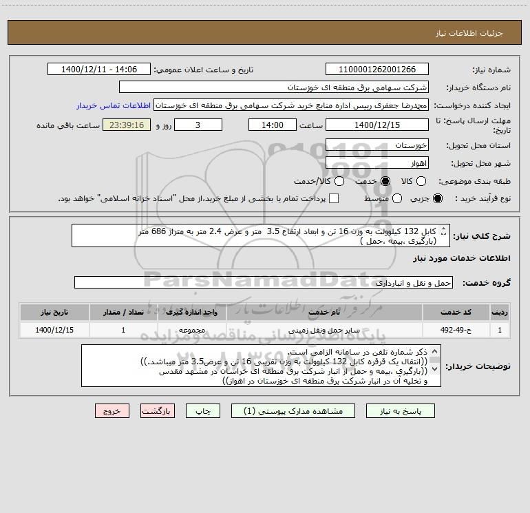شرح کلی نیاز: کابل 132 کیلوولت به وزن 16 تن و ابعاد ارتفاع 3.5 متر و عرض 2.4 متر به متراژ 686 متر