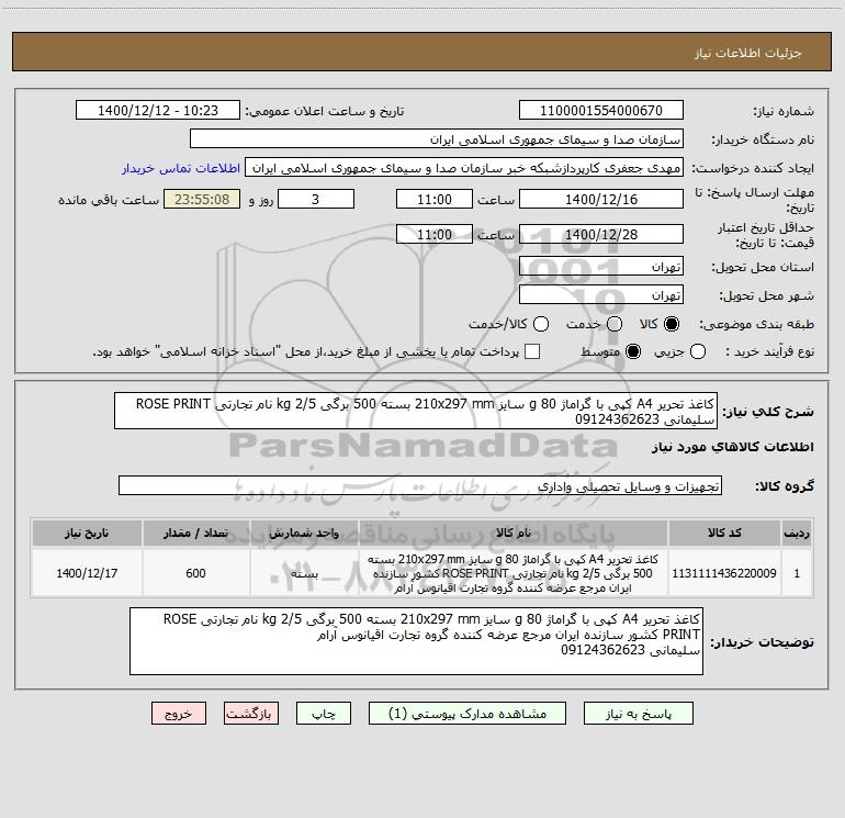 شرح کلی نیاز: کاغذ تحریر A4 کپی با گراماژ 80 g سایز 210x297 mm بسته 500 برگی 2/5 kg نام تجارتی ROSE PRINT