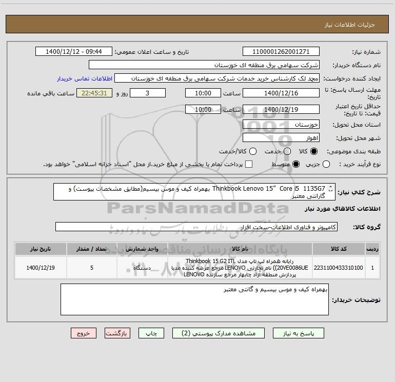 شرح کلی نیاز: Thinkbook Lenovo 15” Core i5 1135G7 بهمراه کیف و موس بیسیم(مطابق مشخصات پیوست) و گارانتی معتبر