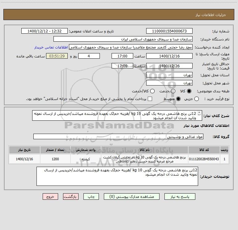 شرح کلی نیاز: 12تن برنج هاشمی درجه یک گونی 10 kg /هزینه حم2ل بعهده فروشنده میباشد/خریدپس از ارسال نمونه وتایید شدن ان انجام میشود