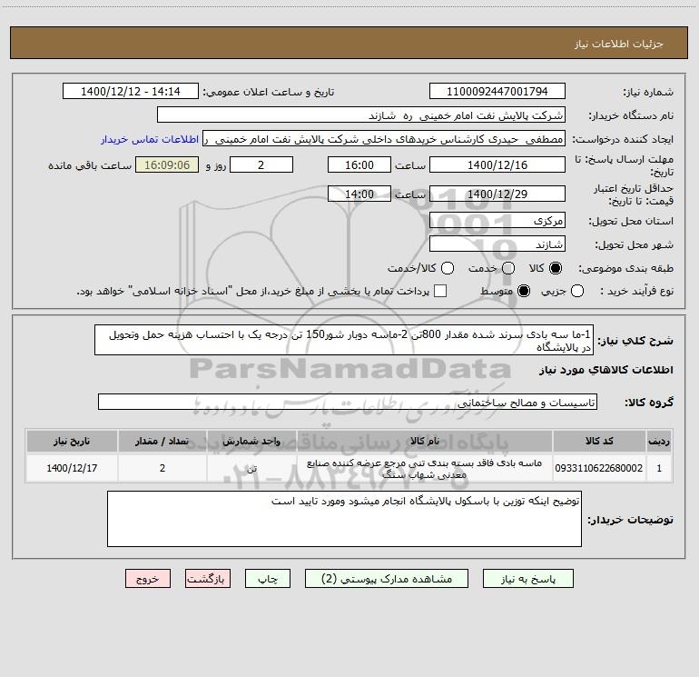 شرح کلی نیاز: 1-ما سه بادی سرند شده مقدار 800تن 2-ماسه دوبار شور150 تن درجه یک با احتساب هزینه حمل وتحویل در پالایشگاه
