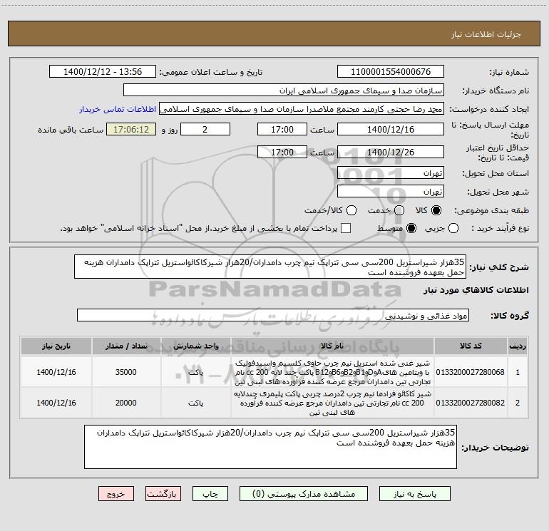 شرح کلی نیاز: 35هزار شیراستریل 200سی سی تتراپک نیم چرب دامداران/20هزار شیرکاکائواستریل تتراپک دامداران هزینه حمل بعهده فروشنده است