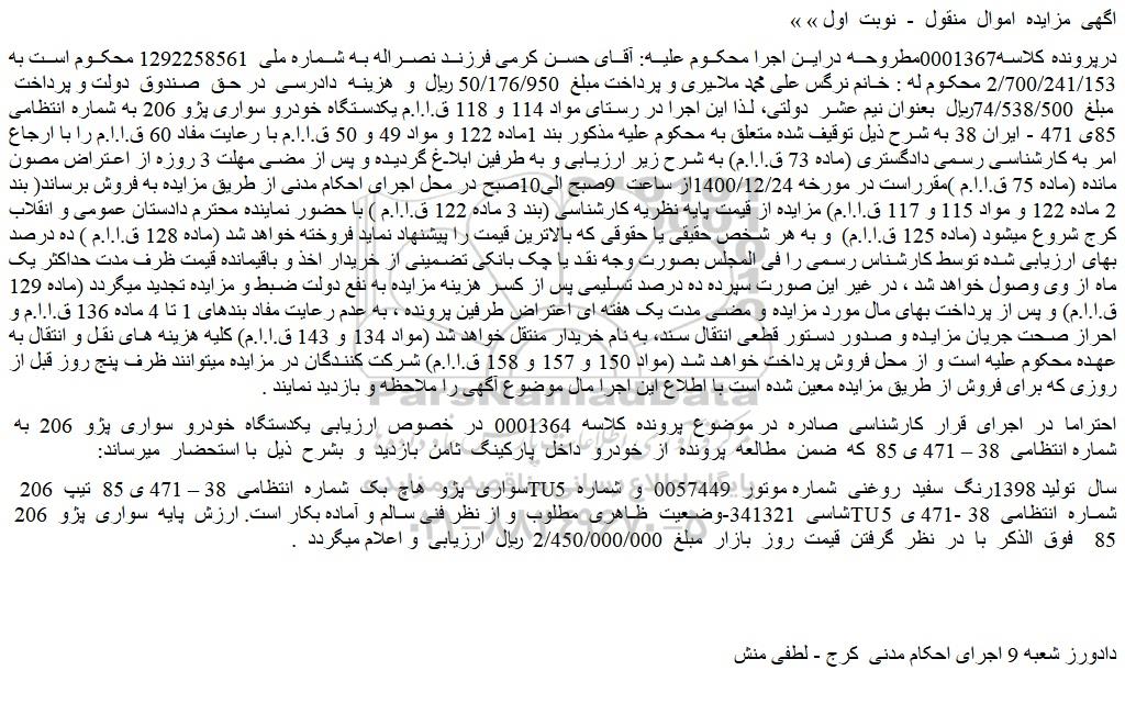 درپرونده کلاسه0001367مطروحه دراین اجرا محکوم علیه: آقای حسن کرمی فرزند نصراله به شماره ملی 1292258561 محکوم است به 2/700/241/153 محکوم له : خانم نرگس علی محمد ملایری و پرداخت مبلغ 50/176/950 ریال و هزینه دادرسی در حق صندوق دولت و پرداخت مبلغ 74/538/500ریال بعنوان نیم عشر دولتی، لذا این اجرا در رستای مواد 114 و 118 ق.ا.ا.م یکدستگاه خودرو سواری پژو 206 به شماره انتظامی 85ی 471 - ایران 38 به شرح ذیل توقیف شده متعلق به محکوم علیه مذکور بند 1ماده 122 و مواد 49 و 50 ق.ا.ا.م با رعایت مفاد 60 ق.ا.ا.م را با ارجاع امر به کارشناسی رسمی دادگستری (ماده 73 ق.ا.ا.م) به شرح زیر ارزیابی و به طرفین ابلاغ گردیده و پس از مضی مهلت 3 روزه از اعتراض مصون مانده (ماده 75 ق.ا.ا.م )مقرراست در مورخه 1400/12/24از ساعت 9صبح الی10صبح در محل اجرای احکام مدنی از طریق مزایده به فروش برساند( بند 2 ماده 122 و مواد 115 و 117 ق.ا.ا.م) مزایده از قیمت پایه نظریه کارشناسی (بند 3 ماده 122 ق.ا.ا.م ) با حضور نماینده محترم دادستان عمومی و انقلاب کرج شروع میشود (ماده 125 ق.ا.ا.م) و به هر شخص حقیقی یا حقوقی که بالاترین قیمت را پیشنهاد نماید فروخته خواهد شد (ماده 128 ق.ا.ا.م ) ده درصد بهای ارزیابی شده توسط کارشناس رسمی را فی المجلس بصورت وجه نقد یا چک بانکی تضمینی از خریدار اخذ و باقیمانده قیمت ظرف مدت حداکثر یک ماه از وی وصول خواهد شد ، در غیر این صورت سپرده ده درصد تسلیمی پس از کسر هزینه مزایده به نفع دولت ضبط و مزایده تجدید میگردد (ماده 129 ق.ا.ا.م) و پس از پرداخت بهای مال مورد مزایده و مضی مدت یک هفته ای اعتراض طرفین پرونده ، به عدم رعایت مفاد بندهای 1 تا 4 ماده 136 ق.ا.ا.م و احراز صحت جریان مزایده و صدور دستور قطعی انتقال سند، به نام خریدار منتقل خواهد شد (مواد 134 و 143 ق.ا.ا.م) کلیه هزینه های نقل و انتقال به عهده محکوم علیه است و از محل فروش پرداخت خواهد شد (مواد 150 و 157 و 158 ق.ا.ا.م) شرکت کنندگان در مزایده میتوانند ظرف پنج روز قبل از روزی که برای فروش از طریق مزایده معین شده است با اطلاع این اجرا مال موضوع آگهی را ملاحظه و بازدید نمایند .