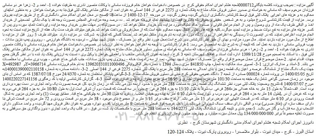 آگهی مزایده : بموجب پرونده کلاسه بایگانی0000712شعبه هشتم اجرای احکام حقوقی کرج در خصوص دادخواست خواهان خانم فروزنده ساسانی با وکالت منصور نادری به طرفیت خوانده 1- احمد و 2- زهرا هر دو ساسانی فرزندان مرحوم سیف اله ساسانی به خواسته ی صدور دستور فروش ملک مشاع به پلاک شماره ی 2275 فرعی از 144 اصلی به عنوان احد از مالکین مشاعی پلاک ثبتی فوق،بنا به درخواست خواهان و به منظور استیفای محکوم به و هزینه های اجرایی پلاک ثبتی فوق توسط کارشناس دادگستری ارزیابی گردیده ومقرر گردیده در مورخه 17-12-1400 از ساعت8تا 9صبح در محل اجرای احکام مدنی دادگستری کرج از طریق مزایده بفروش برسد. مزایده از قیمت کارشناسی شروع میشود و به هر شخص حقیقی و حقوقی که بالاترین قیمت را پیشنهاد نماید فروخته خواهد شد . ده درصد وجه مزایده فی المجلس بصورت وجه نقد یا چک بانکی تضمینی از خریدار اخذ و الباقی ظرف یک ماه از وی وصول و پس از انجام مراحل قانونی و صدور حکم تملیک مورد مزایده بنام خریدار منتقل خواهد شد . در صورتیکه در مهلت مقرر خریدار وجه مزایده راپرداخت ننماید سپرده وی پس از کسر هزینه های مزایده به نفع دولت ضبط و مزایده تجدید میگردد.کلیه هزینه های نقل و انتقال بعهده محکوم علیه است.که از محل فروش پرداخت خواهد شد.طرفین میتوانند ظرف مدت یک هفته از تاریخ مزایده نسبت به نحوه انجام مزایده اعتراض نمایند که در اینصورت تا رسیدگی به اعتراض از سوی دادگاه مورد مزایده به نام خریدار منتقل نخواهد شد. ضمناً کسانی که تمایل به شرکت در مزایده دارند میتوانند ظرف 5 روز قبل از مزایده با اطلاع از مال مورد مزایده بازدید نمایند. مال مورد مزایده و بهای آن طبق نظر کارشناس بدین شرح است:محل مورد نظر واقع در حصارک - خیابان شهید بهشتی – نرسیده به دانشگاه خوارزمی - روبروی پمپ بنزین سادات - چوب فروشی ساسانی ؛ بازدید به عمل آمد که نتیجه آن به شرح ذیل به استحضار می رسد: 1-قرار کارشناسی: با توجه به اعتراض خواهان به نظر ارزیاب در خصوص دادخواست خواهان خانم فروزنده ساسانی با وکالت منصور نادری به طرفیت خوانده 1- احمد و 2- زهرا ؛ هردو ساسانی فرزندان مرحوم سیف اله ساسانی به خواسته ی صدور دستور فروش ملک مشاع به پلاک شماره 2275 فرعی از 144 اصلی به عنوان احراز مالکین مشاعی پلاک ثبتی فوق ، با استناد به تصمیم مورخ 1399/11/28 اداره ثبت اسناد و املاک شهرستان ناحیه 3 کرج ، شما به عنوان کارشناس منتخب با راهنمایی خواهان یا وکیل وی ؛ نسبت به ارزیابی پلاک یاد شده با در نظر گرفتن جمیع جهات اقدام نمایید. 2-محل موضوع قرار: محل موضوع قرار واقع در حصارک - خیابان شهید بهشتی- بعد از سه راه پست خانه - روبروی پمپ بنزین سادات- جنب کبابی حاج عباس - چوب بری ساسانی با مختصات X=492987 و Y=3966714 می باشد. 3-اسناد و مدارک ابرازی: 1-3- تصویر سند مالکیت به شماره چاپ 841850 سری د-سال 1394 با شماره دفتر الکترونیکی 139620331011000496 به نام خانم فروزنده ساسانی جهت یک دانگ مشاع از ششدانگ عرصه و اعیان یک قطعه زمین با بنای احداثی به مساحت 288 متر مربع با پلاک ثبتی شماره 2275 فرعی از 144 اصلی. 2-3- دادنامه صادره به شماره 140001390002110158به تاریخ 1400/05/05 در پرونده شماره 000024 صادره از شعبه 7 دادگاه عمومی حقوقی کرج مبنی بر دستور فروش ملک مشاع. 3-3-گواهی پایانکار ساختمان به شماره 24/4370 مورخ 1387/07/18 که بر اساس آن بنای موجود در زمان صدور گواهی شامل یک طبقه به مساحت 101/30 متر مربع بعنوان تجاری و 16/95 متر مربع بعنوان راه پله و انباری بوده است. 3-4- گزارش کارشناسی اولیه با کد رهگیری 1400220227141156 مورخ 1400/07/07 4-تشریح وضعیت: پلاک ثبتی مورد نظر ششدانگ یک قطعه زمین به مساحت 288 متر مربع با حدود اربعه ذیل می باشد که در زمان بازدید کل عرصه بصورت یک واحد تجاری در دست بهره برداری بوده است. الف-شمالاً به طول 15 متر به خانه همدانی جزء264 فرعی. ب-شرقاً به طول 15/10 به جزء 264 فرعی. ج-جنوباً در سه قسمت که قسمت دوم آن شرقی است.اول به طول 10/80 متر به جزء 264 فرعی.دوم به طول 14 متر به جزء 264 فرعی و سوم درب و دیواریست به طول 4/10 متر به پیاد