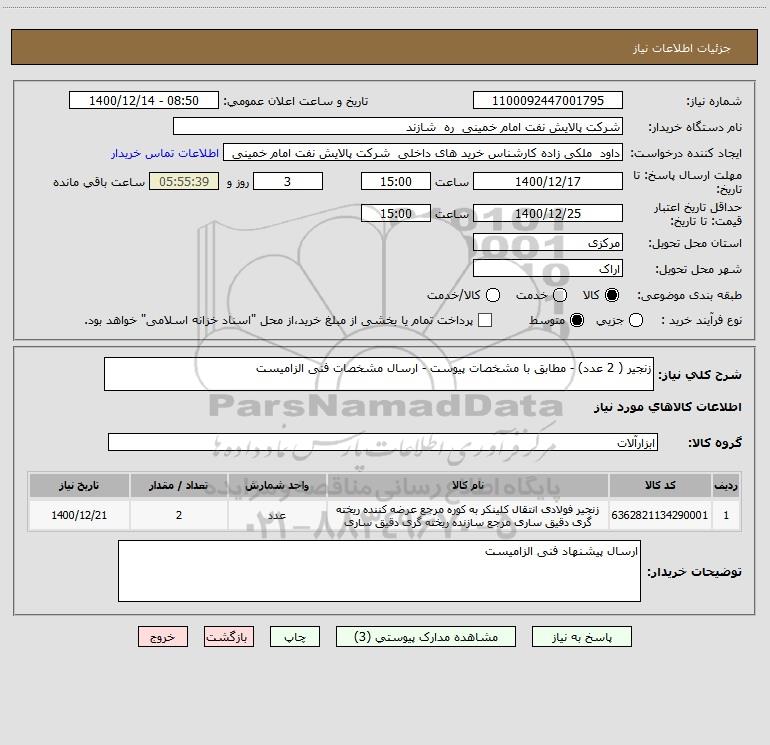 شرح کلی نیاز: زنجیر ( 2 عدد) - مطابق با مشخصات پیوست - ارسال مشخصات فنی الزامیست