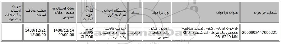 مناقصه، فراخوان ارزیابی کیفی تجدید مناقصه عمومی یک مرحله ای شماره RND-9818249-MM, فراخوان ارزیابی کیفی تجدید مناقصه عمومی یک مرحله ای شماره RND-9818249-MM