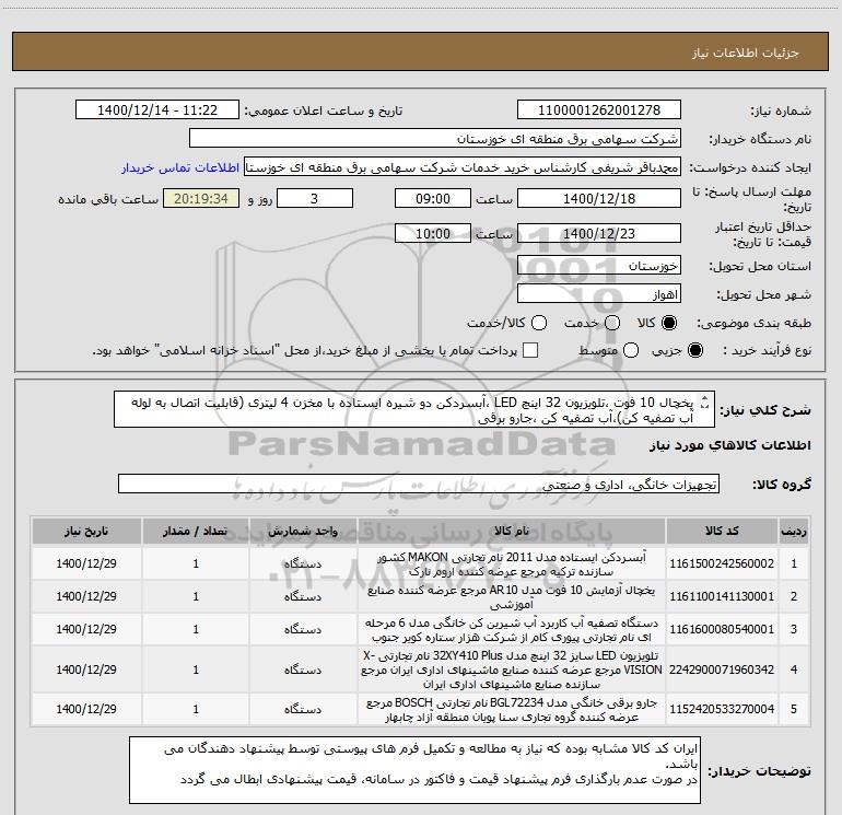 استعلام یخچال 10 فوت ،تلویزیون 32 اینچ LED ،آبسردکن دو شیره ایستاده با مخزن 4 لیتری (قابلیت اتصال به لوله آب تصفیه کن)،آب تصفیه کن ،جارو برقی , استعلام یخچال 10 فوت ،تلویزیون 32 اینچ LED ،آبسردکن دو شیره ایستاده با مخزن 4 لیتری (قابلیت اتصال به لوله آب تصفیه کن)،آب تصفیه کن ،جارو برقی