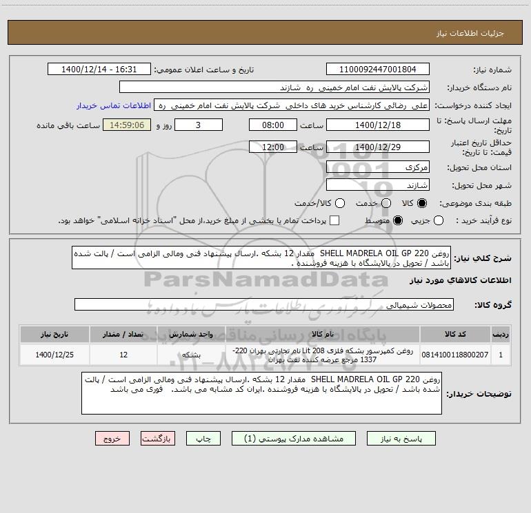 شرح کلی نیاز: روغن 220 SHELL MADRELA OIL GP مقدار 12 بشکه .ارسال پیشنهاد فنی ومالی الزامی است / پالت شده باشد / تحویل در پالایشگاه با هزینه فروشنده .