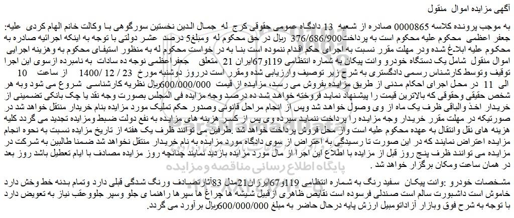 به موجب پرونده کلاسه 0000865 صادره از شعبه 13 دادگاه عمومی حقوقی کرج له جمال الدین نخستین سورگوهی با وکالت خانم الهام کردی علیه: جعفر اعظمی محکوم علیه محکوم است به پرداخت376/686/900 ریال در حق محکوم له ومبلغ5 درصد عشر دولتی با توجه به اینکه اجرائیه صادره به محکوم علیه ابلاغ شده ودر مهلت مقرر نسبت به اجرای حکم اقدام ننموده است بنا به در خواست محکوم له به منظور استیفای محکوم به وهزینه اجرایی اموال منقول شامل یک دستگاه خودرو وانت پیکان به شماره انتظامی 119و67ایران 21 متعلق جعفراعظمی نوجه ده سادات به نامبرده ازسوی این اجرا توقیف وتوسط کارشناس رسمی دادگستری به شرح زیر توصیف وارزیابی شده ومقرر است درروز دوشنبه مورخ 23 / 12 /1400 از ساعت 10 الی 11 در محل اجرای احکام مدنی از طریق مزایده بفروش می رسد، مزایده از قیمت 600/000/000ریال نظریه کارشناسی شروع می شود وبه هر شخص حقیقی وحقوقی که بالاترین قیمت را پیشنهاد نماید فروخته خواهد شد ده درصد وجه مزایده فی المجلس بصورت وجه نقد یا چک بانکی تضمینی از خریدار اخذ والباقی ظرف یک ماه از وی وصول خواهد شد وپس از انجام مراحل قانونی وصدور حکم تملیک مورد مزایده بنام خریدار منتقل خواهد شد در صورتیکه در مهلت مقرر خریدار وجه مزایده را پرداخت ننماید سپرده وی پس از کسر هزینه های مزایده به نفع دولت ضبط ومزایده تجدید می گردد کلیه هزینه های نقل وانتقال به عهده محکوم علیه است واز محل فروش پرداخت خواهد شد .طرفین می توانند ظرف یک هفته از تاریخ مزایده نسبت به نحوه انجام مزایده اعتراض نمایند که در این صورت تا رسیدگی به اعتراض از سوی دادگاه مورد مزایده به نام خریدار منتقل نخواهد شد ضمنا طالبین به شرکت در مزایده می توانند ظرف پنج روز قبل از مزایده با اطلاع این اجرا از مال مورد مزایده بازدید نمایند چنانچه روز مزایده مصادف با ایام تعطیل باشد روز بعد در همان ساعت ومکان برگزار خواهد شد .
