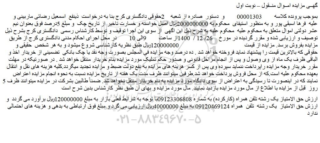 بموجب پرونده کلاسه 00001303 و دستور صادره از شعبه 2حقوقی دادگستری کرج بنا به درخواست ذینفع اسمعیل رضائی ماربینی و علیه فرها اسبقی پور و به منظور استیفای محکوم به 2000000000ریال اصل خواسته و خسارت تاخیر از تاریخ چک و مبلغ 5درصد فوق بعنوان نیم عشر دولتی اموال متعلق به محکوم علیه محکوم علیه به شرح ذیل این اگهی از سوی این اجرا توقیف و توسط کارشناس رسمی دادگستری کرج بشرح ذیل توصیف و ارزیابی شده و مقرر گردیده در مورخ 26/ 12 / 1400از ساعت 9الی 10 در محل اجرای احکام مدنی دادگستری کرج از طریق مزایده بفروش برسد. مزایده از قیمت 120000000ریال طبق نظریه کارشناسی شروع میشود و به هر شخص حقیقی و حقوقی که بالاترین قیمت را پیشنهاد نماید فروخته خواهد شد . ده درصد وجه مزایده فی المجلس بصورت وجه نقد یا چک بانکی تضمینی از خریدار اخذ و الباقی ظرف یک ماه از وی وصول و پس از انجام مراحل قانونی و صدور حکم تملیک مورد مزایده بنام خریدار منتقل خواهد شد . در صورتیکه در مهلت مقرر خریدار وجه مزایده راپرداخت ننماید سپرده وی پس از کسر هزینه های مزایده به نفع دولت ضبط و مزایده تجدید میگردد.کلیه هزینه های نقل و انتقال بعهده محکوم علیه است.که از محل فروش پرداخت خواهد شد.طرفین میتوانند ظرف مدت یک هفته از تاریخ مزایده نسبت به نحوه انجام مزایده اعتراض نمایند که در اینصورت تا رسیدگی به اعتراض از سوی دادگاه مورد مزایده به نام خریدار منتقل نخواهد شد. ضمناً طالبین بشرکت در مزایده میتوانند ظرف 5 روز قبل از مزایده با اطلاع از مال مورد مزایده بازدید نمایند. مال مورد مزایده و بهای آن طبق نظر کارشناس بدین شرح است