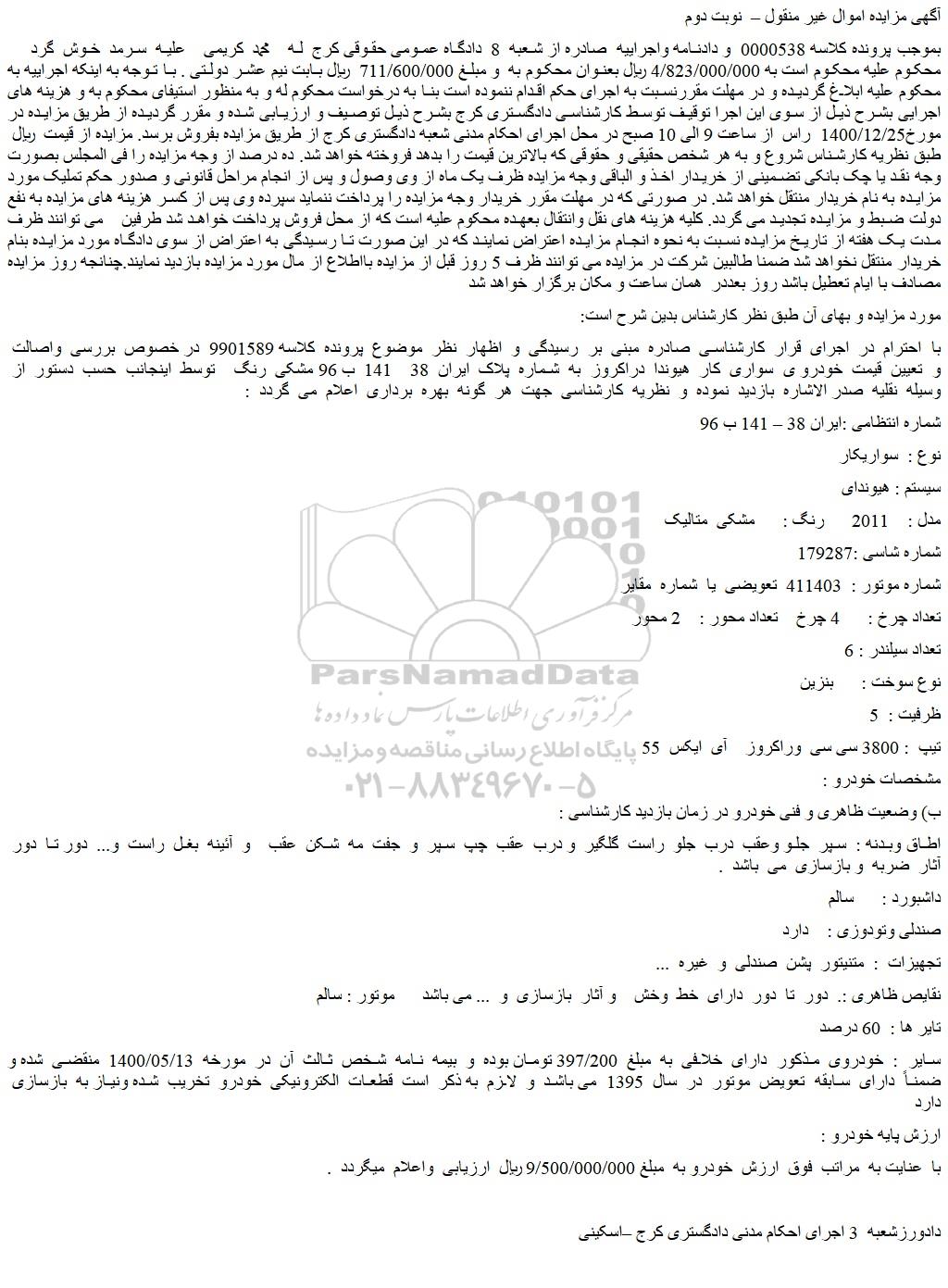 بموجب پرونده کلاسه 0000538 و دادنامه واجراییه صادره از شعبه 8 دادگاه عمومی حقوقی کرج له محمد کریمی علیه سرمد خوش گرد محکوم علیه محکوم است به 4/823/000/000 ریال بعنوان محکوم به و مبلغ 711/600/000 ریال بابت نیم عشر دولتی . با توجه به اینکه اجراییه به محکوم علیه ابلاغ گردیده و در مهلت مقررنسبت به اجرای حکم اقدام ننموده است بنا به درخواست محکوم له و به منظور استیفای محکوم به و هزینه های اجرایی بشرح ذیل از سوی این اجرا توقیف توسط کارشناسی دادگستری کرج بشرح ذیل توصیف و ارزیابی شده و مقرر گردیده از طریق مزایده در مورخ1400/12/25 راس از ساعت 9 الی 10 صبح در محل اجرای احکام مدنی شعبه دادگستری کرج از طریق مزایده بفروش برسد. مزایده از قیمت ریال طبق نظریه کارشناس شروع و به هر شخص حقیقی و حقوقی که بالاترین قیمت را بدهد فروخته خواهد شد. ده درصد از وجه مزایده را فی المجلس بصورت وجه نقد یا چک بانکی تضمینی از خریدار اخذ و الباقی وجه مزایده ظرف یک ماه از وی وصول و پس از انجام مراحل قانونی و صدور حکم تملیک مورد مزایده به نام خریدار منتقل خواهد شد. در صورتی که در مهلت مقرر خریدار وجه مزایده را پرداخت ننماید سپرده وی پس از کسر هزینه های مزایده به نفع دولت ضبط و مزایده تجدید می گردد. کلیه هزینه های نقل وانتقال بعهده محکوم علیه است که از محل فروش پرداخت خواهد شد طرفین می توانند ظرف مدت یک هفته از تاریخ مزایده نسبت به نحوه انجام مزایده اعتراض نمایند که در این صورت تا رسیدگی به اعتراض از سوی دادگاه مورد مزایده بنام خریدار منتقل نخواهد شد ضمنا طالبین شرکت در مزایده می توانند ظرف 5 روز قبل از مزایده بااطلاع از مال مورد مزایده بازدید نمایند.چنانجه روز مزایده مصادف با ایام تعطیل باشد روز بعددر همان ساعت و مکان برگزار خواهد شد