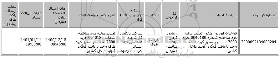 مناقصه، فراخوان ارزیابی کیفی تجدید مرتبه دوم مناقصه شماره 0040180 خرید 7000 عدد آجر نسوز کوره های واحد بازیافت گوگرد (تولید داخل کشور از کلیه افراد متخصص و شرکت‌ها واجد شرایط دعوت به عمل می‌آید در مناقصه با کد خبرگزاری پارس نماد: 4327762 شرکت نمایند. این مناقصه در تاریخ 1400/12/15 شروع و مهلت آن تا تاریخ 1401/01/11 میباشد.