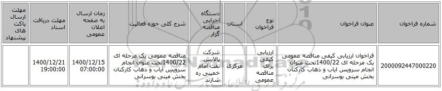 | 2000092447000220 | فراخوان ارزیابی کیفی مناقصه عمومی یک مرحله ای 1400/22تحت عنوان انجام سرویس ایاب و ذهاب کارکنان بخش مینی بوسرانی | ارزیابی کیفی برای مناقصه عمومی | مرکزی | شرکت پالایش نفت امام خمینی ره شازند | مناقصه عمومی یک مرحله ای 1400/22تحت عنوان انجام سرویس ایاب و ذهاب کارکنان بخش مینی بوسرانی | 1400/12/15 07:00:00 | 1400/12/21 19:00:00 |