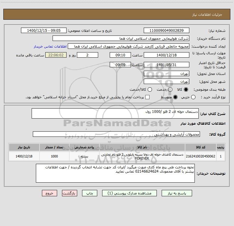شرح کلی نیاز: دستمال حوله ای 2 قلو /1000 رول