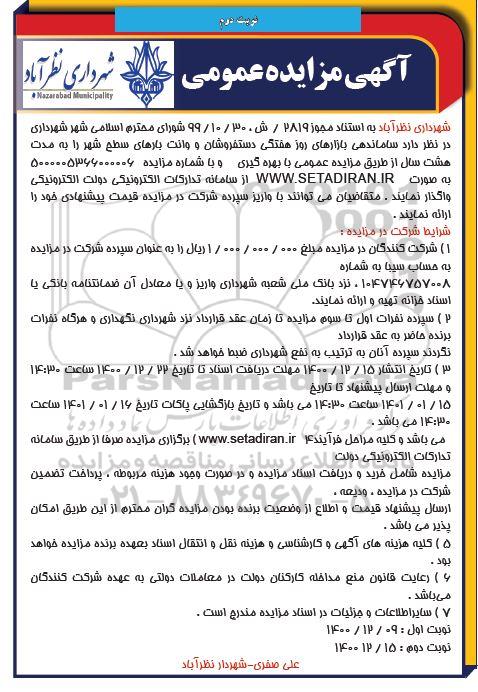 شهرداری نظراباد به استناد مجوز شماره 2819/ ش 99.10.30 شورای محترم اسلایم شهر شهرداری در نظر دارد ساماندهی بازارهای روز هفتگی ، دستفروشان و وانت بارهای سطح شهر را به مدت هشت سال از طریق مزایده عمومی با بهره گیری از سامانه تدارکات الکترونیکی دولت و با شماره مزایده 5000005366000006 به صورت الکترونیکی واگذار نماید.متقاضیان می توانند با واریز سپرده شرکت در مزایده پیشنهادی خود را ارائه نمایند.