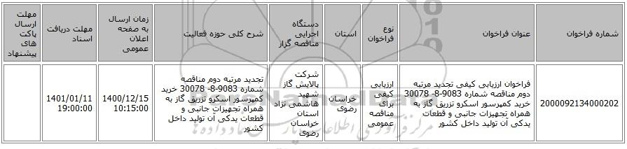 مناقصه، فراخوان ارزیابی کیفی تجدید مرتبه دوم مناقصه شماره 9083-8- 30078 خرید کمپرسور اسکرو تزریق گاز به همراه تجهیزات جانبی و قطعات یدکی آن تولید داخل کشور, فراخوان ارزیابی کیفی تجدید مرتبه دوم مناقصه شماره 9083-8- 30078 خرید کمپرسور اسکرو تزریق گاز به همراه تجهیزات جانبی و قطعات یدکی آن تولید داخل کشور