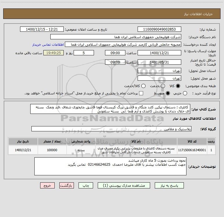 شرح کلی نیاز: کاتلری : دستمال نپکین کارد چنگال و قاشق بزرگ کریستال فوما قاشق چایخوری شفاف ،قند ونمک بسته ای خلال دندان با پوشش کاغذی و آرم هما نی بسته سلفونی