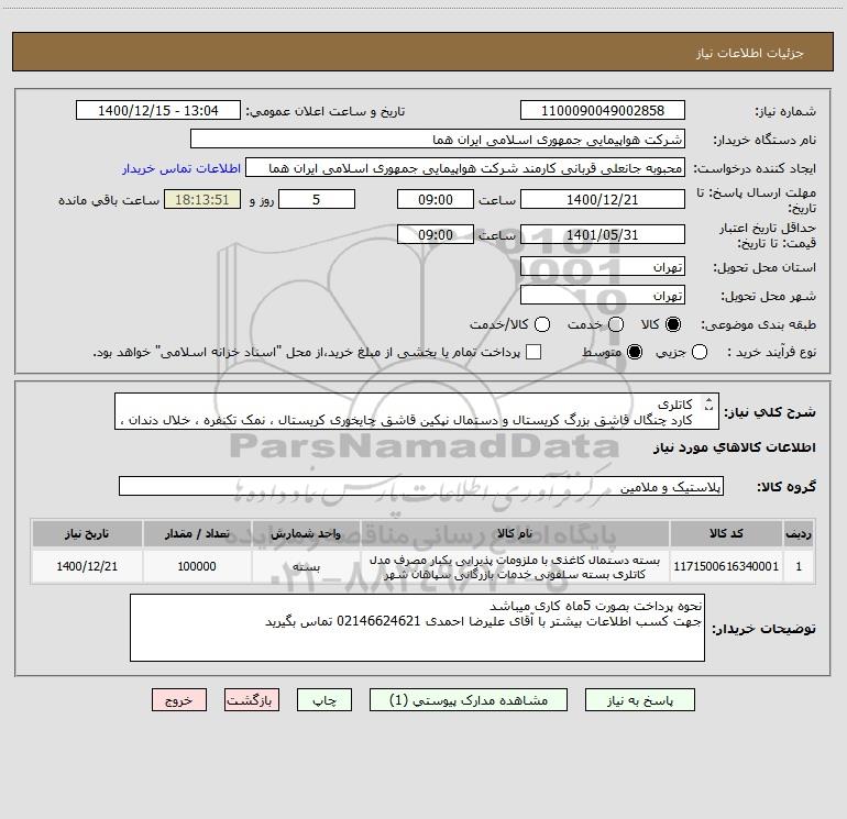 | 1 | 1171500616340001 | بسته دستمال کاغذی با ملزومات پذیرایی یکبار مصرف مدل کاتلری بسته سلفونی خدمات بازرگانی سپاهان شهر | بسته | 100000 | 1400/12/21 |