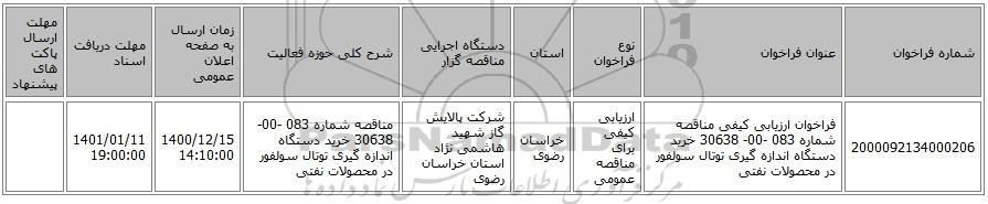مناقصه، فراخوان ارزیابی کیفی مناقصه شماره 083 -00- 30638 خرید دستگاه اندازه گیری توتال سولفور در محصولات نفتی, فراخوان ارزیابی کیفی مناقصه شماره 083 -00- 30638 خرید دستگاه اندازه گیری توتال سولفور در محصولات نفتی