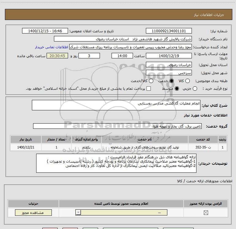 نام دستگاه خریدار:شرکت پالایش گاز شهید هاشمی نژاد استان خراسان رضوی