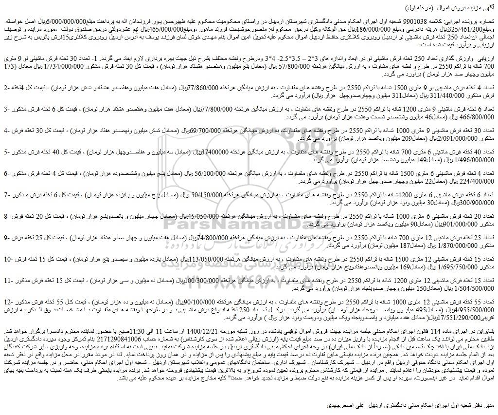 شماره پرونده اجرایی: کلاسه 9901038 شعبه اول اجرای احکام مدنی دادگستری شهرستان اردبیل در راستای محکومیت محکوم علیه ظهیرحسن پور فرزنداذن اله به پرداخت مبلغ6/000/000/000ریال اصل خواسته  ومبلغ325/461/200ریال هزینه دادرسی ومبلغ 186/000/000ریال حق الوکاله وکیل درحق  محکوم له: منصورخوشبخت فرزند ماهور ،ومبلغ465/000/000ریال نیم عشردولتی درحق صندوق دولت  ،مورد مزایده و توصیف اجمالی آن:تعداد 250 تخته فرش ماشینی نو اردبیل روبروی کلانتری حافظ اردبیل اموال محکوم علیه تحویل امین اموال بنام مهدی خوش لسان فرزند یوسف به آدرس اردبیل روبروی کلانتری15فرش پاتریس به شرح زیر ارزیابی و برآورد قیمت شده است؛