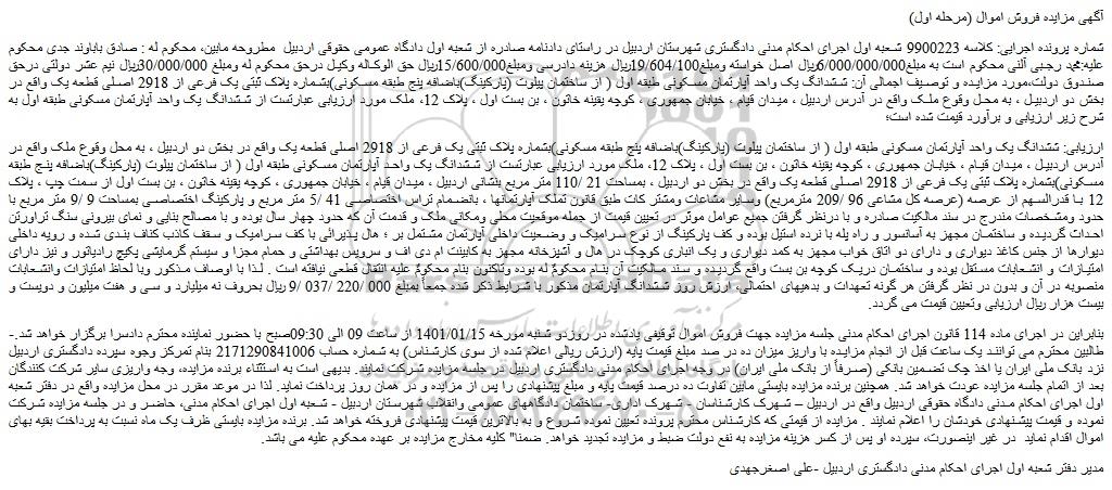 شماره پرونده اجرایی: کلاسه 9900223 شعبه اول اجرای احکام مدنی دادگستری شهرستان اردبیل در راستای دادنامه صادره از شعبه اول دادگاه عمومی حقوقی اردبیل  مطروحه مابین، محکوم له : صادق باباوند جدی محکوم علیه:محمد رجبی آلنی محکوم است به مبلغ6/000/000/000ریال اصل خواسته ومبلغ19/604/100ریال هزینه دادرسی ومبلغ15/600/000ریال حق الوکاله وکیل درحق محکوم له ومبلغ 30/000/000ریال نیم عشر دولتی درحق صندوق دولت،مورد مزایده و توصیف اجمالی آن: ششدانگ یک واحد آپارتمان مسکونی طبقه اول ( از ساختمان پیلوت (پارکینگ)باضافه پنج طبقه مسکونی)بشماره پلاک ثبتی یک فرعی از 2918 اصلی قطعه یک واقع در بخش دو اردبیل ، به محل وقوع ملک واقع در آدرس اردبیل ، میدان قیام ، خیابان جمهوری ، کوچه یقینه خاتون ، بن بست اول ، پلاک 12، ملک مورد ارزیابی عبارتست از ششدانگ یک واحد آپارتمان مسکونی طبقه اول به شرح زیر ارزیابی و برآورد قیمت شده است؛