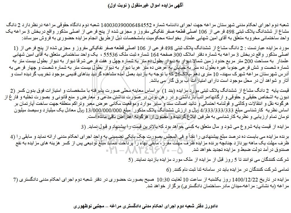 1) مورد مزایده عبارتست : 2 دانگ مشاع از ششدانگ پلاک ثبتی 498 فرعی از 106 اصلی قطعه صفر تفکیکی مفروز و مجزی شده از پنج فرعی از اصلی مذکور واقع دربخش 3 مراغه به شماره دفتر املاک 300 صفحه 164 شماره ثبت ملک 55536 ،  یک واحد ساختمانی متعلق به آقای امین شهابی علمدار  به مساحت 200 متر مربع حدود زمین شمالا دیوار به دیوار بطول ده متر به شماره چهل و هفت فرعی شرقا دیوار به دیوار بطول بیست متر به شماره شصت و شش فرعی جنوبا غیره بطول ده متر به خیابان به عرض ده متر غربا دیوار به دیوار بطول بیست متر به شماره شصت و چهار فرعی به آدرس شهرستان مراغه شهرک سهند- 10 متری دهم -پلاک26 که با توجه به بازدید بعمل آمده مشاهده گردید بناهای قدیمی موجود تخریب گردیده است و آثار و شواهد آن در محل موجود است دارای امتیازات آب برق گاز می باشد.