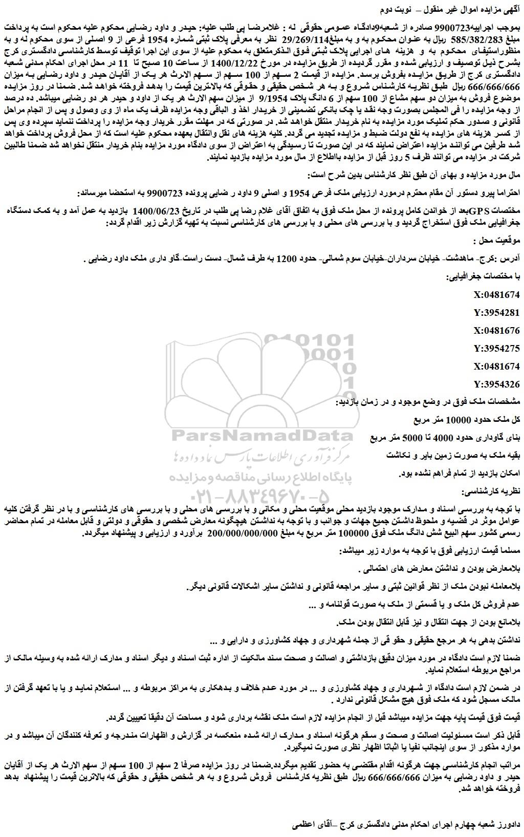 بموجب اجراییه9900723 صادره از شعبه9دادگاه عمومی حقوقی  له : غلامرضا پی طلب علیه: حیدر و داود رضایی محکوم علیه محکوم است به پرداخت مبلغ 585/382/283  ریال به عنوان محکوم به و به مبلغ29/269/114  نظر به معرفی پلاک ثبتی شماره 1954 فرعی از 9 اصلی از سوی محکوم له و به منظوراستیفای  محکوم  به  و  هزینه  های اجرایی پلاک ثبتی فوق الذکرمتعلق به محکوم علیه از سوی این اجرا توقیف توسط کارشناسی دادگستری کرج بشرح ذیل توصیف و ارزیابی شده و مقرر گردیده از طریق مزایده در مورخ 1400/12/22 از ساعت 10 صبح تا  11 در محل اجرای احکام مدنی شعبه دادگستری کرج از طریق مزایده بفروش برسد. مزایده از قیمت 2 سهم از 100 سهم از سهم الارث هر یک از آقایان حیدر و داود رضایی به میزان 666/666/666 ریال  طبق نظریه کارشناس شروع و به هر شخص حقیقی و حقوقی که بالاترین قیمت را بدهد فروخته خواهد شد. ضمنا در روز مزایده موضوع فروش به میزان دو سهم مشاع از 100 سهم از 6 دانگ پلاک 9/1954  از میزان سهم الارث هر یک از داود و حیدر هر دو رضایی میباشد. ده درصد از وجه مزایده را فی المجلس بصورت وجه نقد یا چک بانکی تضمینی از خریدار اخذ و الباقی وجه مزایده ظرف یک ماه از وی وصول و پس از انجام مراحل قانونی و صدور حکم تملیک مورد مزایده به نام خریدار منتقل خواهد شد. در صورتی که در مهلت مقرر خریدار وجه مزایده را پرداخت ننماید سپرده وی پس از کسر هزینه های مزایده به نفع دولت ضبط و مزایده تجدید می گردد. کلیه هزینه های نقل وانتقال بعهده محکوم علیه است که از محل فروش پرداخت خواهد شد طرفین می توانند مزایده اعتراض نمایند که در این صورت تا رسیدگی به اعتراض از سوی دادگاه مورد مزایده بنام خریدار منتقل نخواهد شد ضمنا طالبین شرکت در مزایده می توانند ظرف 5 روز قبل از مزایده بااطلاع از مال مورد مزایده بازدید نمایند.