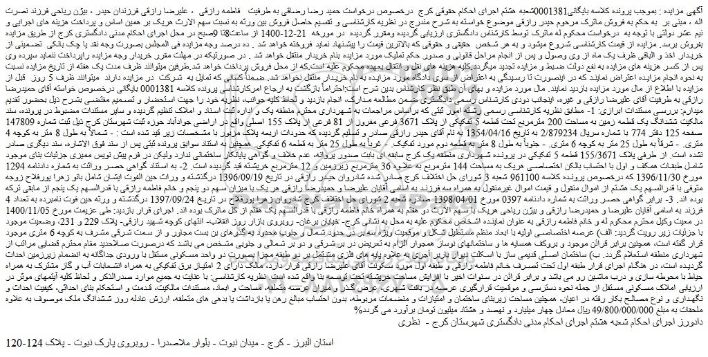 بموجب پرونده کلاسه بایگانی0001381شعبه هشتم اجرای احکام حقوقی کرج درخصوص درخواست حمید رضا رضاقی به طرفیت فاطمه رازقی ، علیرضا رازقی فرزندان حیدر ، بیژن ریاحی فرزند نصرت اله ، مبنی بر به حکم به فروش ماترک مرحوم حیدر رازقی موضوع خواسته به شرح مندرج در نظریه کارشناسی و تقسیم حاصل فروش بین ورثه به نسبت سهم الارث هریک بر همین اساس و پرداخت هزینه های اجرایی و نیم عشر دولتی با توجه به درخواست محکوم له ماترک توسط کارشناس دادگستری ارزیابی گردیده ومقرر گردیده در مورخه 21-12-1400 از ساعت8تا 9صبح در محل اجرای احکام مدنی دادگستری کرج از طریق مزایده بفروش برسد. مزایده از قیمت کارشناسی شروع میشود و به هر شخص حقیقی و حقوقی که بالاترین قیمت را پیشنهاد نماید فروخته خواهد شد . ده درصد وجه مزایده فی المجلس بصورت وجه نقد یا چک بانکی تضمینی از خریدار اخذ و الباقی ظرف یک ماه از وی وصول و پس از انجام مراحل قانونی و صدور حکم تملیک مورد مزایده بنام خریدار منتقل خواهد شد . در صورتیکه در مهلت مقرر خریدار وجه مزایده راپرداخت ننماید سپرده وی پس از کسر هزینه های مزایده به نفع دولت ضبط و مزایده تجدید میگردد.کلیه هزینه های نقل و انتقال بعهده محکوم علیه است.که از محل فروش پرداخت خواهد شد.طرفین میتوانند ظرف مدت یک هفته از تاریخ مزایده نسبت به نحوه انجام مزایده اعتراض نمایند که در اینصورت تا رسیدگی به اعتراض از سوی دادگاه مورد مزایده به نام خریدار منتقل نخواهد شد. ضمناً کسانی که تمایل به شرکت در مزایده دارند میتوانند ظرف 5 روز قبل از مزایده با اطلاع از مال مورد مزایده بازدید نمایند. مال مورد مزایده و بهای آن طبق نظر کارشناس بدین شرح است:احتراماً بازگشت به ارجاع امرکارشناسی پرونده کلاسه 0001381 بایگانی درخصوص خواسته آقای حمیدرضا رازقی به طرفیت آقای علیرضا رازقی و غیره، اینجانب دودی کارشناس رسمی دادگستری ضمن مطالعه مدارک، انجام بازدید و لحاظ کلیه جوانب، نظریه خود را جهت استحضار و تصمیم مقتضی بشرح ذیل بحضور تقدیم میدارم: بررسی مستندات ابرازی: 1- مطابق نظریه کارشناسی رسمی رشته امور ثبتی که براساس مراجعات به شهرداری محترم منطقه یک و اداره ثبت اسناد و املاک تنظیم گردیده و سایر مستندات مضبوط در پرونده، سند مالکیت ششدانگ یک قطعه زمین به مساحت 200 مترمربع تحت قطعه 5 تفکیکی از پلاک 3671 فرعی مفروز از 81 فرعی از پلاک 155 اصلی واقع در اراضی جوادآباد حوزه ثبت شهرستان کرج ذیل ثبت شماره 147809 صفحه 125 دفتر 774 با شماره سریال 2/879234 به تاریخ 1354/04/16 به نام آقای حیدر رازقی صادر و تسلیم گردیده که حدودات اربعه پلاک مزبور با مشخصات زیر قید شده است : - شمالاً به طول 8 متر به کوچه 4 متری. - شرقاً به طول 25 متر به کوچه 6 متری. - جنوباً به طول 8 متر به قطعه دوم مورد تفکیک. - غرباً به طول 25 متر به قطعه 6 تفکیکی. همچنین به استناد سوابق پرونده ثبتی پس از سند فوق الاشاره، سند دیگری صادر نشده است. از طرفی پلاک 155/3671 قطعه 5 تفکیکی در پرونده شهرداری منطقه یک کرج سابقه ای بابت صدور پروانه، عدم خلاف و گواهی پایانکار ساختمانی ندارد ولیکن در فرم پیش نویس ممیزی جزئیات بنای موجود شامل طبقات همکف و اول با احتساب بالکن اختصاصی هریک به مساحت 144 مترمربع به علاوه 36 مترمربع زیرزمین و 12 مترمربع خرپشته قید گردیده است. 2- به استناد گواهی حصر وراثت به شماره دادنامه 1294 مورخ 1396/11/30 که درخصوص پرونده کلاسه 961100 شعبه 3 شورای حل اختلاف کرج صادر شده شادروان حیدر رازقی در تاریخ 1396/09/19 درگذشته و وراث حین الفوت ایشان شامل بانو زهرا پورفلاح زوجه متوفی با قدرالسهم یک هشتم از اموال منقول و قیمت اموال غیرمنقول به همراه سه فرزند به اسامی آقایان علیرضا و حمیدرضا رازقی هر یک با میزان سهم دو پنجم و خانم فاطمه رازقی با قدرالسهم یک پنجم از مابقی ترکه بوده اند. 3- برابر گواهی حصر وراثت به شماره دادنامه 0397 مورخ 1398/04/01 صادره شعبه 2 شورای حل اختلاف کرج شادروان زهرا پورفلاح در تاریخ 1397/09/24 درگذشته و ورثه حین فوت نامبرده به تعداد 4 ف