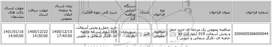 | 2000005366000044 | مناقصه عمومی یک مرحله ای خرید حمل و پخش آسفالت 019 (بلوار آیت اله خامنه ای -کارگر شمالی و جنوبی ) | مناقصه عمومی | البرز | شهرداری نظرآباد | خرید حمل و پخش آسفالت 019 (بلوار آیت اله خامنه ای -کارگر شمالی و جنوبی ) | 1400/12/15 17:40:00 | 1400/12/22 14:30:00 | 1401/01/16 14:00:00 |