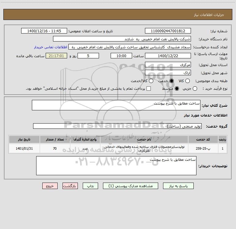 شرح کلی نیاز: ساخت مطابق با شرح پیوست