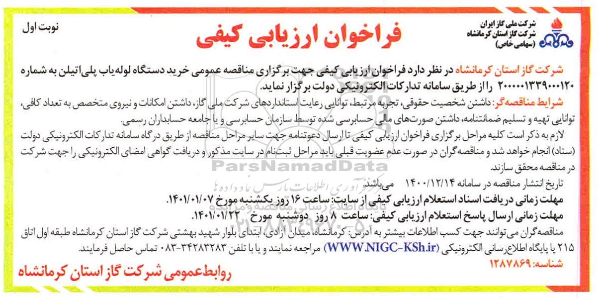 شرکت گاز استان کرمانشاه در نظر دارد فراخوان ارزیابی کیفی جهت برگزاری مناقصه عمومی خرید دستگاه لوله یاب پلی اتیلن به شماره 2000001339000120 را از طریق مناقصه عمومی به انجام برساند.