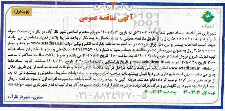 شهرداری نظرآباد به استناد مجوز شماره 4666/ 1400/ ش به تاریخ 1400.12.12 شورای محترم اسلامی شهر نظر آباد در نظر دارد ساخت لوله با برآورد اولیه 50.000.000.000 ریال را از طریق مناقصه عمومی به مدت یک سال به پیمانکاران واجد شرایط واگذار نماید متقاضیان می توانند جهت کسب اطلاعات بیشتر و دریافت اوراق شرکت در مناقصه به سامانه تدارکات الکترونیکی دولت سامانه ستاد مراجعه و مبلغ 2.500.000.000 ریال به عنوان سپرده شرکت در مناقصه به حساب سیبا به شماره 0104746757008 بانک ملی واریز و یا معادل آن اسناد خزانه تهیه نماینده شروع فروش اسناد از تاریخ 1400.12.25 لغایت ساعت 14 تاریخ 1401.1.6 می باشد و تحویل پاکات مناقصه حداکثر تا ساعت ۱۴ تاریخ 1401.1.18 در سامانه ستاد و تاریخ بازگشایی پاکات ساعت 14.30 تاریخ 1401.1.20 میباشد خرید اسناد فقط از سامانه ستاد امکان پذیر میباشد و کلیه مراحل فرایند مناقصه شامل خرید و دریافت اسناد مناقصه از این طریق امکان پذیر میباشد و بدیهی است و شهرداری در رد یا قبول پیشنهاد داد صاحب اختیار بوده و به پیشنهادات مشروط مخدوش و پیشنهاداتی که بعد از موعد مقرر واصل گردد ترتیب اثر داده نخواهد شد هزینه آگهی به عهده برنده مناقصه خواهد بود سپرده نفرات اول تا سوم مناقصه تا زمان عقد قرارداد نزد شهرداری نگهداری و هر با نفرات برنده حاضر به عقد قرارداد داد نگردند سپرده آنان به ترتیب به نفع شهرداری ثبت خواهد شد