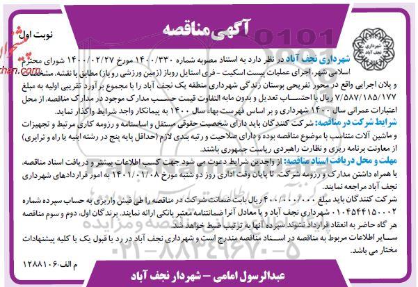 شهرداری نجف آباد در نظر دارد اجرای عملیات پیست اسکیت - فری استایل روباز ( زمین ورزشی روباز ) مطابق با نقشه مشخصات و پلان اجرایی واقع در محور تفریحی بوستان زندگی شهرداری منطقه یک نجف آباد را با مجموع براورد تقریبی اولیه به مبلغ 7.587.185.177 ریال با احتساب تعدیل و بدون مابه تفاوت قیمت حسب مدارک موجود در مدارک مناقصه از محل اعتبارات عمرانی سال 1400 شهرداری و براساس فهرست بها سال 1400 به پیمانکار واجد شرایط واگذار نماید.