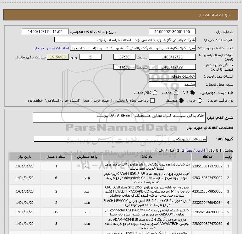نام دستگاه خریدار:شرکت پالایش گاز شهید هاشمی نژاد استان خراسان رضوی
