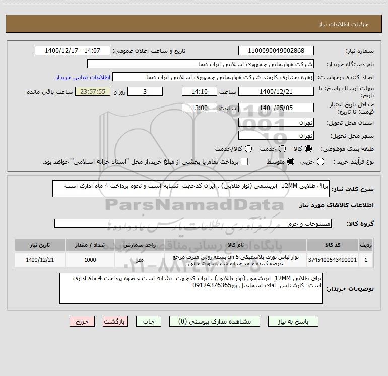شرح کلی نیاز: یراق طلایی 12MM ابریشمی (نوار طلایی) . ایران کدجهت تشابه است و نحوه پرداخت 4 ماه اداری است