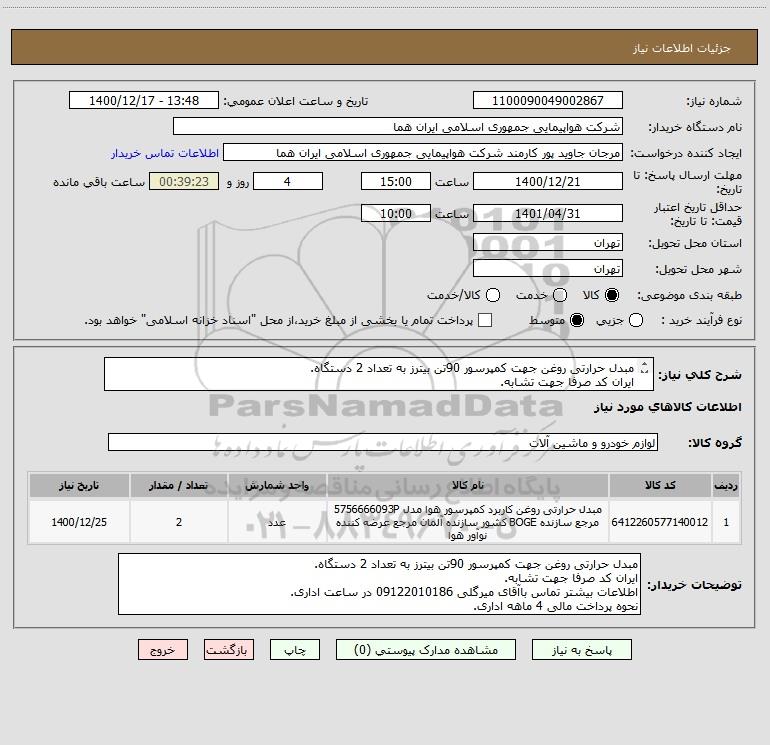 توضیحات خریدار:مبدل حرارتی روغن جهت کمپرسور 90تن بیترز به تعداد 2 دستگاه. ایران کد صرفا جهت تشابه. اطلاعات بیشتر تماس باآقای میرگلی 09122010186 در ساعت اداری. نحوه پرداخت مالی 4 ماهه اداری.
