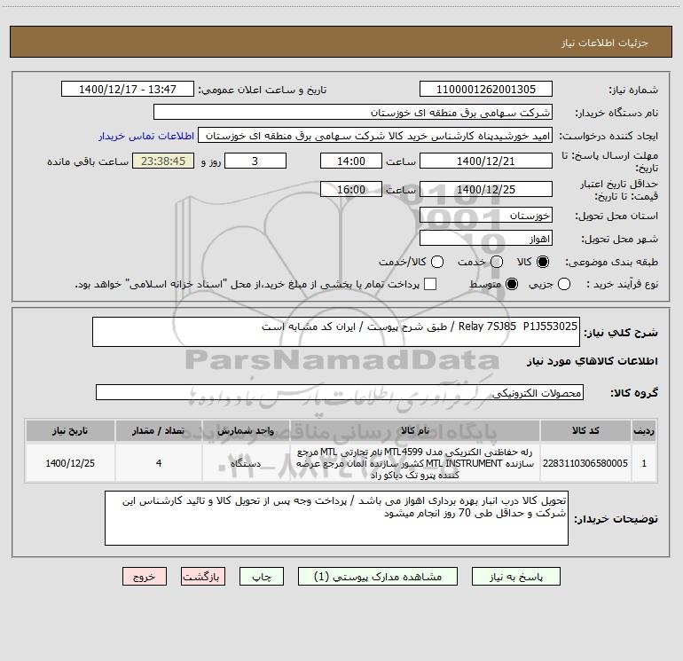 شرح کلی نیاز: Relay 7SJ85 P1J553025 / طبق شرح پیوست / ایران کد مشابه است