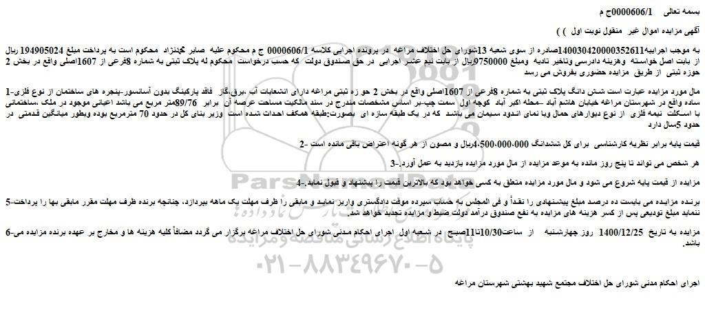 به موجب اجراییه140030420000352611صادره از سوی شعبه 13شورای حل اختلاف مراغه  در پرونده اجرایی کلاسه 0000606/1 ج م محکوم علیه  صابر محمدنژاد  محکوم است به پرداخت مبلغ 194905024 ریال از بابت اصل خواسته  وهزینه دادرسی وتاخیر تادیه  ومبلغ 9750000ریال از بابت نیم عشر اجرایی  در حق صندوق دولت  که حسب درخواست  محکوم له پلاک ثبتی به شماره 8فرعی از 1607اصلی واقع در بخش 2 حوزه ثبتی  از طریق  مزایده حضوری بفروش می رسد
