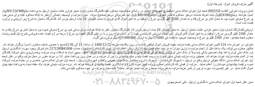 شماره پرونده اجرایی: کلاسه 0002320 شعبه اول اجرای احکام مدنی دادگستری شهرستان اردبیل در راستای محکومیت محکوم علیه کشتارگاه شماره یازده ممیز هزارو هشت سامیان اردبیل به پرداخت مبلغ393/524/969ریال اصل خواسته  ومبلغ624/000ریال بابت تعرفه خدمات درحق  محکوم له:حسن مهرپور ،ومبلغ1/800/000ریال نیم عشردولتی درحق صندوق دولت  ،مورد مزایده و توصیف اجمالی آن:نظر به اینکه محکوم علیه برای بدهی خود پر مرغ معرفی نموده بود به محل انبار پر مرغ رفته و به مقدار 2500 کیلو گرم پر مرغ را توقیف و به امین اموال آقای فروتن به محل کیلومتر 10 جاده اردبیل پارس آباد کشتارگاه سامیان به شرح زیر ارزیابی و برآورد قیمت شده است؛