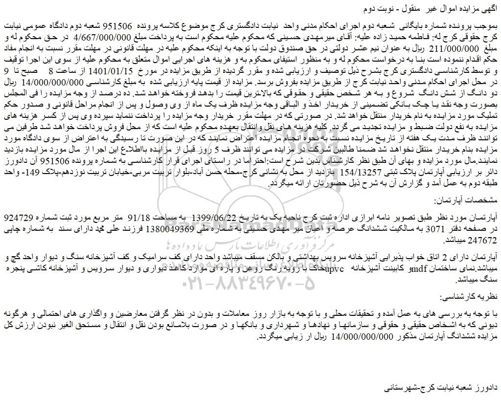 بموجب پرونده شماره بایگانی شعبه دوم اجرای احکام مدنی واحد نیابت دادگستری کرج موضوع کلاسه پرونده 951506 شعبه دوم دادگاه عمومی نیابت کرج حقوقی کرج له: فاطمه حمید زاده علیه: آقای میرمهدی حسینی که محکوم علیه محکوم است به پرداخت مبلغ 4/667/000/000 در حق محکوم له و مبلغ 211/000/000 ریال به عنوان نیم عشر دولتی در حق صندوق دولت با توجه به اینکه محکوم علیه در مهلت قانونی در مهلت مقرر نسبت به انجام مفاد حکم اقدام ننموده است بنا به درخواست محکوم له و به منظور استیفای محکوم به و هزینه های اجرایی اموال متعلق به محکوم علیه از سوی این اجرا توقیف و توسط کارشناسی دادگستری کرج بشرح ذیل توصیف و ارزیابی شده و مقرر گردیده از طریق مزایده در مورخ 1401/01/15 از ساعت 8 صبح تا 9 در محل اجرای احکام مدنی واحد نیابت کرج از طریق مزایده بفروش برسد. مزایده از قیمت پایه ارزیابی شده به مبلغ کارشناسی 14/000/000/000 ریال دو دانگ از شش دانگ شروع و به هر شخص حقیقی و حقوقی که بالاترین قیمت را بدهد فروخته خواهد شد. ده درصد از وجه مزایده را فی المجلس بصورت وجه نقد یا چک بانکی تضمینی از خریدار اخذ و الباقی وجه مزایده ظرف یک ماه از وی وصول و پس از انجام مراحل قانونی و صدور حکم تملیک مورد مزایده به نام خریدار منتقل خواهد شد. در صورتی که در مهلت مقرر خریدار وجه مزایده را پرداخت ننماید سپرده وی پس از کسر هزینه های مزایده به نفع دولت ضبط و مزایده تجدید می گردد. کلیه هزینه های نقل وانتقال بعهده محکوم علیه است که از محل فروش پرداخت خواهد شد طرفین می توانند ظرف مدت یک هفته از تاریخ مزایده نسبت به نحوه انجام مزایده اعتراض نمایند که در این صورت تا رسیدگی به اعتراض از سوی دادگاه مورد مزایده بنام خریدار منتقل نخواهد شد ضمنا طالبین شرکت در مزایده می توانند ظرف 5 روز قبل از مزایده بااطلاع این اجرا از مال مورد مزایده بازدید نمایند.مال مورد مزایده و بهای آن طبق نظر کارشناس بدین شرح است:احتراما در راستای اجرای قرار کارشناسی به شماره پرونده 951506 آن دادورز دائر بر ارزیابی آپارتمان پلاک ثبتی 154/13257 بازدید از محل به نشانی کرج-محله حسن آباد-بلوار تربیت مربی-خیابان تربیت نوزدهم-پلاک 149- واحد طبقه دوم به عمل آمد و گزارش آن به شرح ذیل حضورتان ارائه میگردد.