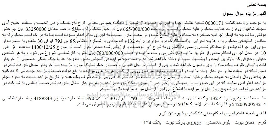 به موجب پرونده کلاسه 0000171 شعبه هشتم اجرا و اجرائیه صادره از شعبه 1 دادگاه عمومی حقوقی کرج له: بانک قرض الحسنه رسالت  علیه: آقای سجاد شاهپوری فرزند عنایت محکوم علیه محکوم است به پرداخت 665/000/000ریال در حق محکوم له ومبلغ5 درصد معادل 33250000 ریال نیم عشر دولتی با توجه به اینکه اجرائیه صادره به محکوم علیه ابلاغ شده ودر مهلت مقرر نسبت به اجرای حکم اقدام ننموده است بنا به در خواست محکوم له به منظور استیفای محکوم به و هزینه اجرایی  یکدستگاه خودرو سواری پراید 132نوک مدادی به شماره انتظامی85 س 793 ایران 30 متعلق به نامبرده از سوی این اجرا توقیف و توسط کارشناس رسمی دادگستری به شرح زیر توصیف و ارزیابی شده است.  مقرر است در مورخ 1400/12/25 ساعت   9   الی  10  در محل اجرای احکام مدنی از طریق مزایده بفروش می رسد، مزایده از قیمت 780/000/000 ریال نظریه کارشناسی شروع می شود و به هر شخص حقیقی وحقوقی که بالاترین قیمت را پیشنهاد نماید فروخته خواهد شد. ده درصد وجه مزایده فی المجلس بصورت وجه نقد یا چک بانکی تضمینی از خریدار اخذ والباقی ظرف یک ماه از وی وصول خواهد شد و پس از انجام مراحل قانونی و صدور حکم تملیک مورد مزایده بنام خریدار منتقل خواهد شد. در صورتیکه در مهلت مقرر خریدار وجه مزایده را پرداخت ننماید سپرده وی پس از کسر هزینه های مزایده به نفع دولت ضبط ومزایده تجدید می گردد کلیه هزینه های نقل وانتقال به عهده محکوم علیه است واز محل فروش پرداخت خواهد شد. طرفین می توانند ظرف یک هفته از تاریخ مزایده نسبت به نحوه انجام مزایده اعتراض نمایند که در این صورت تا رسیدگی به اعتراض از سوی دادگاه مورد مزایده به نام خریدار منتقل نخواهد شد. ضمنا طالبین به شرکت در مزایده می توانند ظرف پنج روز قبل از مزایده با اطلاع این اجرا از مال مورد مزایده بازدید نمایند.