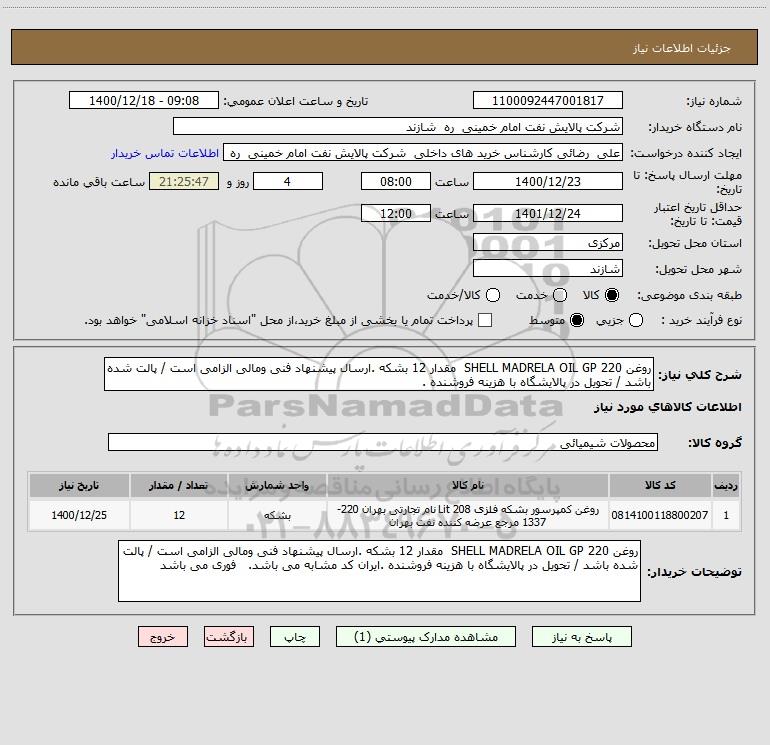 شرح کلی نیاز: روغن 220 SHELL MADRELA OIL GP مقدار 12 بشکه .ارسال پیشنهاد فنی ومالی الزامی است / پالت شده باشد / تحویل در پالایشگاه با هزینه فروشنده .
