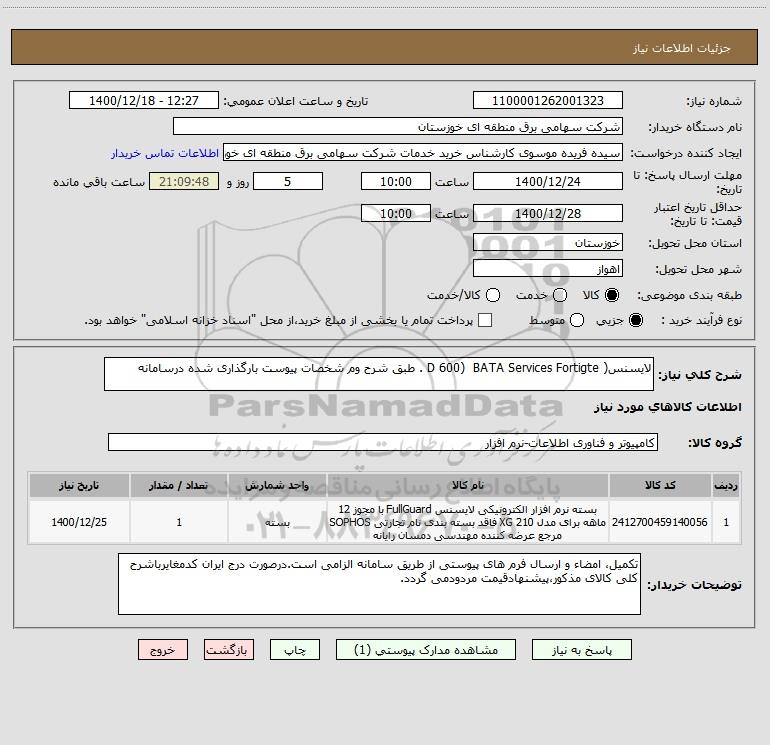 شرح کلی نیاز: لایسنس( D 600) BATA Services Fortigte . طبق شرح وم شخصات پیوست بارگذاری شده درسامانه
