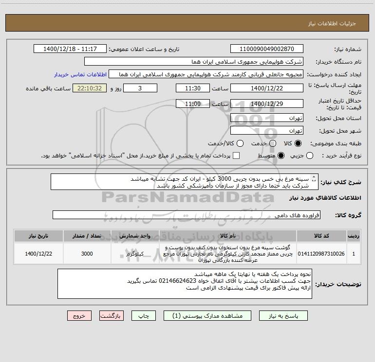 شرح کلی نیاز: سینه مرغ بی خس بدون چربی 3000 کیلو - ایران کد جهت تشابه میباشد