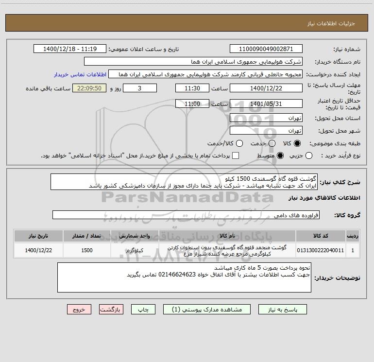 شرح کلی نیاز: گوشت قلوه گاه گوسفندی 1500 کیلو