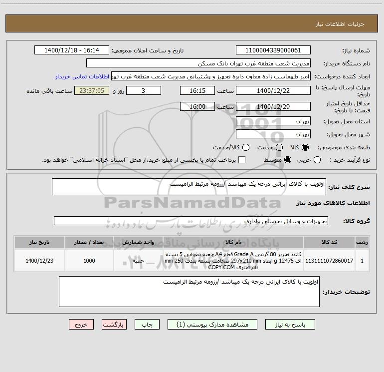 نام دستگاه خریدار:مدیریت شعب منطقه غرب تهران بانک مسکن