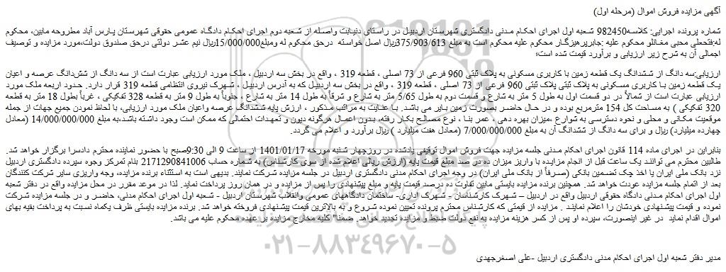 شماره پرونده اجرایی: کلاسه982450 شعبه اول اجرای احکام مدنی دادگستری شهرستان اردبیل در راستای دنیابت واصله از شعبه دوم اجرای احکام دادگاه عمومی حقوقی شهرستان پارس آباد مطروحه مابین، محکوم له:فتحعلی محبی مغانلو محکوم علیه :جابرپرهیزگار محکوم علیه محکوم است به مبلغ 375/903/613ریال اصل خواسته  درحق محکوم له ومبلغ15/000/000ریال نیم عشر دولتی درحق صندوق دولت،مورد مزایده و توصیف اجمالی آن به شرح زیر ارزیابی و برآورد قیمت شده است؛